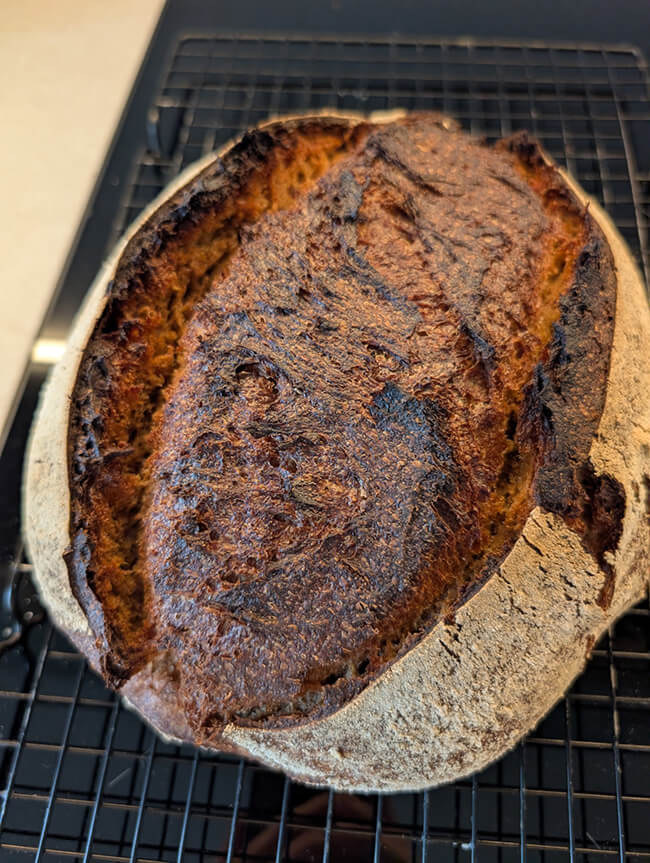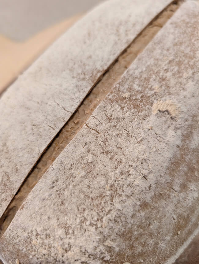 Hier siehst du ein Beispiel für eine Kruste eines Vollkornbrots mit Übergare. Der Schnitt reißt das Brot stark auf, obwohl nicht tief geschnitten wurde.