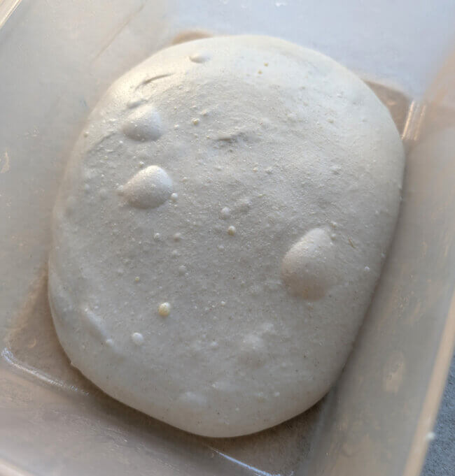 Bei einem Weizenteig oder auch einem Weizenmisch-Teig, mit viel Weizenanteil, siehst du an der Oberfläche deines Teigs Luftbläschen. Achte darauf, dass dort einige zu sehen sind. Auch ein paar größere Luftbläschen sprechen dafür, dass der Teig schon gut aufgereift ist. Gute Beispiele dafür siehst du hier auf den nachstehenden Fotos: Die Teige haben Stand (sind also noch nicht zu weit gereift, das bedeutet, die Teige haben noch nicht zu stark abgebaut (Glutenabbau durch Enzymatik)) und gleichzeitig sind Luftbläschen (CO₂) im deutlich zu sehen.