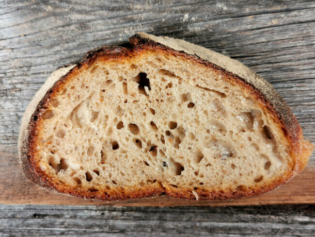Mittelhelles Mehl aus Frankreich und ein Roggenmehl Typ 1150 geben dem Brot eine rustikale Note, die vor allem in der wirklich sehr knusprigen Kruste zum Vorschein kommt.