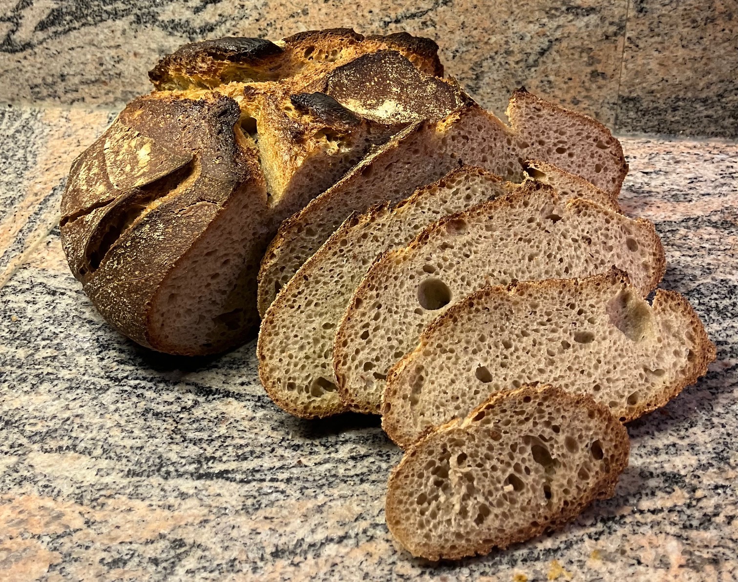 Ich habs mit VK Dinkel und VK Roggen und dafür hellem Weizenmehl gemacht. Etwa 12 g Wasser aus der Bassinage und vielleicht ein Tick länger geknetet… Am gleichen Tag ohne Form im Ofen gebacken.