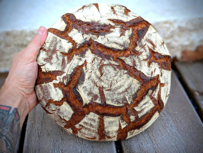 Das Brot ist ausschließlich mit Sauerteig gebacken. Kein Gramm Hefe ist nötig. 40% des Roggenmehls sind versäuert worden. Das verleiht dem Brot natürlich auch einen schönen Roggen-Sauerteig-Geschmack und lässt es maximal bekömmlich und haltbar werden.