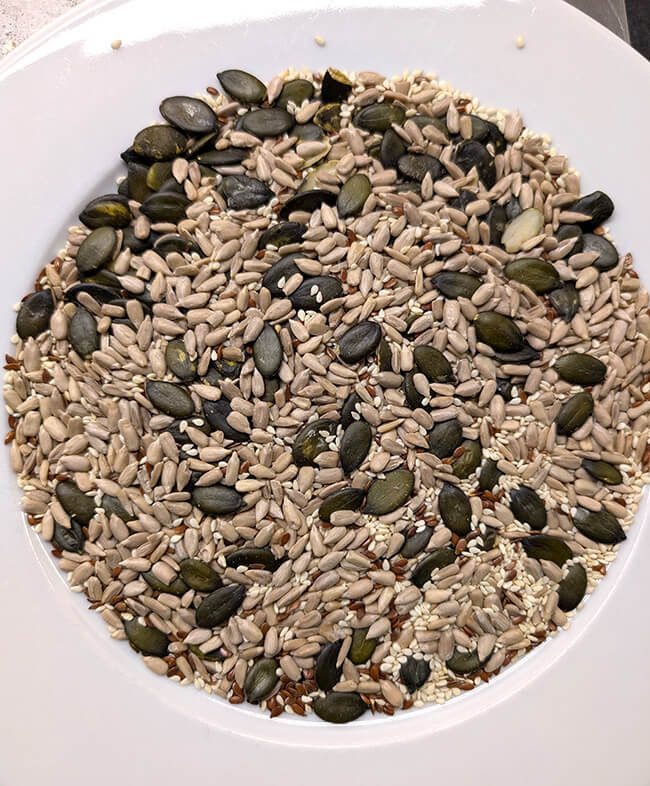 Saaten und Kerne auf einem Teller für das Wälzen der Teiglinge