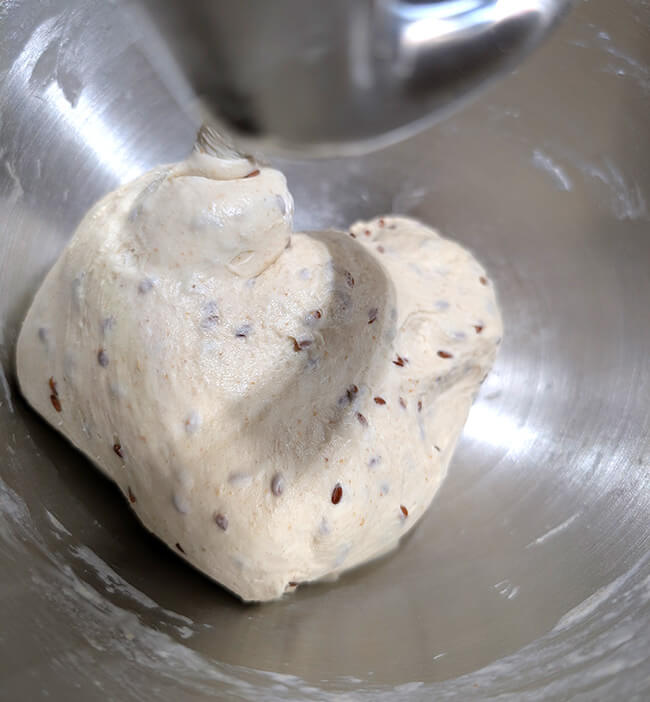 Die Leinsamen könnte man verquellen mit Wasser, da sie aber ganz sind, schlucken sie ohnehin nicht so viel Wasser. Die 20g Leinsamen können also direkt in den Hauptteig gehen, ohne Risiko, dass das Brot trocken werden könnte.