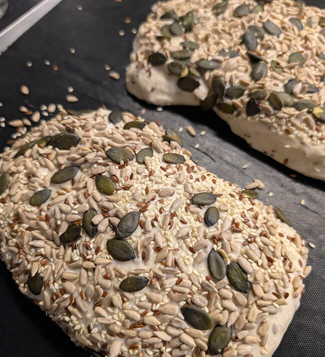 12:45 Uhr Teig rund geformt, in Körnern gewälzt, auf Backpapier abgelegt und abgedeckt