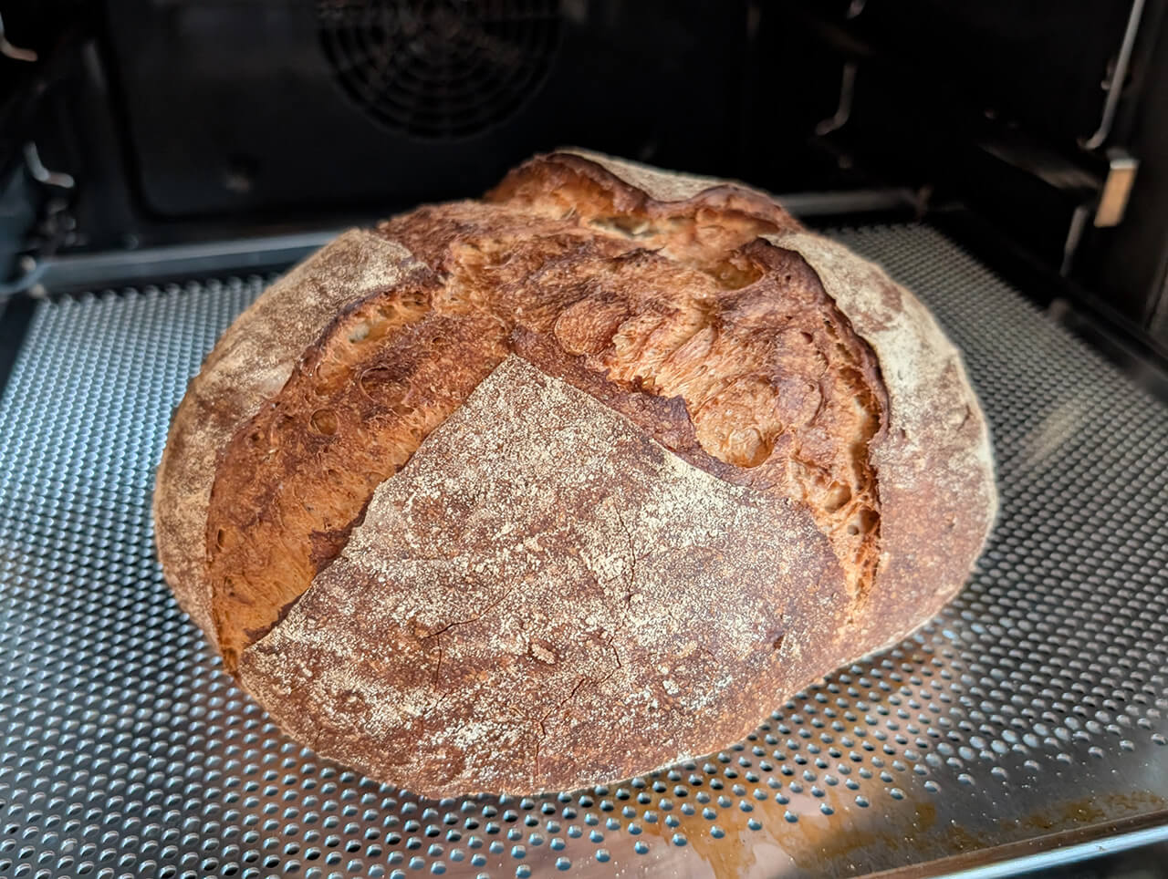 Etwas anders sieht es aus, wenn du ein professionelles Backblech verwendest, wie ich es hier verwendet habe: Dieses Alu-Backblech (*Partnerlink), mit vielen kleinen Löchern, lässt sehr viel Hitze von unten durch und so kann das Brot super aufgehen. Ich denke, die beiden Brote hier im Rezept sind der perfekte Beweis dafür. Der Vorteil eines solchen Backblechs ist, dass der Ofen nicht so lange aufgeheizt werden muss. Du sparst also Energie, bei ähnlich gutem Ergebnis. Hier kannst du nochmal nachlesen, welche Vor- und Nachteile das Backen auf Blech hat und worauf du besonders achten musst.